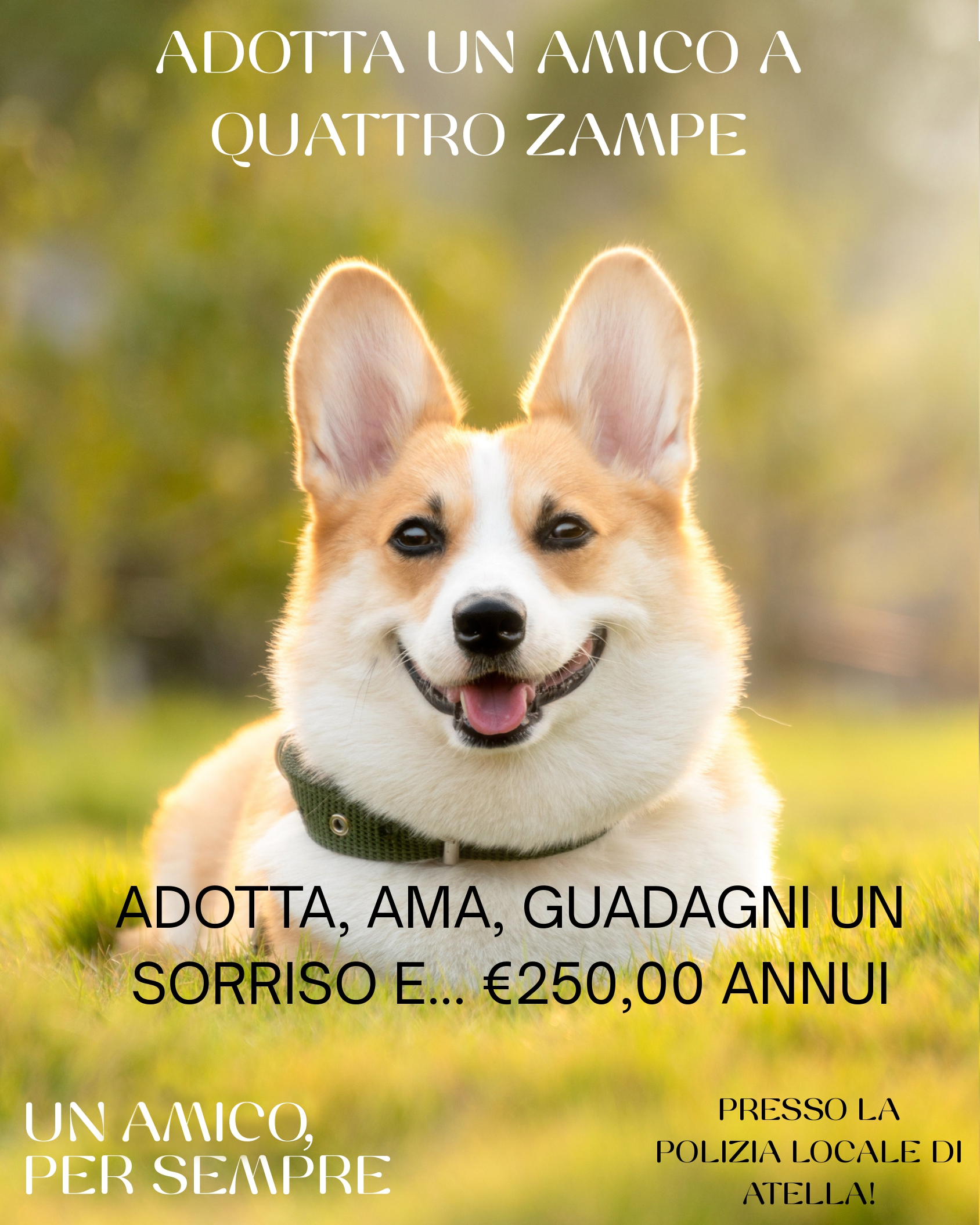 Testo completo title COMUNE DI ATELLA Provincia di Potenza Bando: Adotta un amico a quattro zampe Il Comune di Atella ha pubblicato il bando pubblico per la concessione del contributo economico annuale “Bonus Benessere Animale”, destinato ai cittadini che adotteranno i cani randagi di proprietà comunale attualmente ospitati nel canile convenzionato. L’iniziativa mira a promuovere l’adozione responsabile e il benessere degli animali, offrendo un contributo di €250,00 annui a chi accoglierà un amico a quattro zampe nella propria casa. Le domande di partecipazione e il testo completo del bando sono disponibili sul sito istituzionale del Comune al seguente link: 👉 https://atella.halleyegov.it/amministrazione/trasparenza/bandi_di_concorso/scheda_bando_di_concorso_1.html 📍 Le adozioni possono essere effettuate presso la Polizia Locale di Atella. Slogan dell’iniziativa: “Adotta, ama, guadagni un sorriso e… €250,00 annui. Un amico, per sempre!”